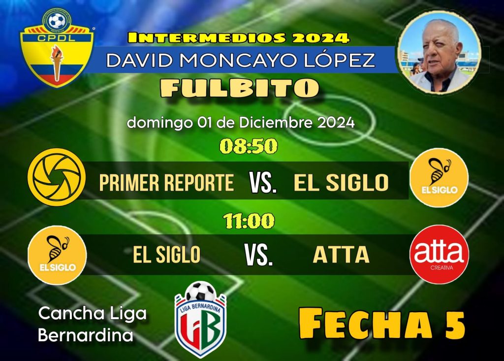 Este domingo 01 de diciembre desde las 08h50, se juega la fecha 5 del FULBITO, de esta jornada saldrá el segundo finalista que jugará frente al equipo de SEXTO PODER buscando el título de CAMPEÓN de esta disciplina.